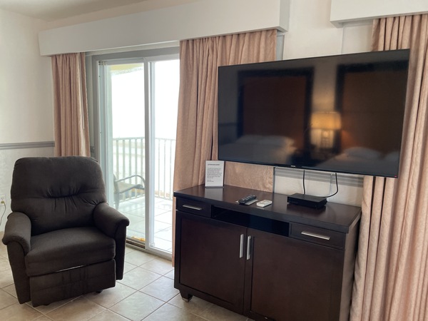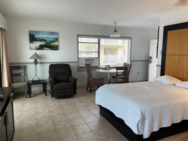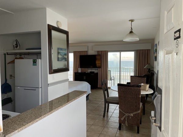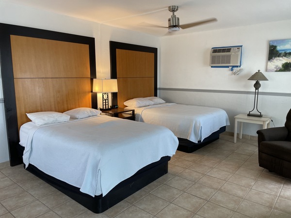 Large Oceanfront Efficiency Room with Two Queen Beds and a Full Kitchen. Private balcony overlooking the pool and the beach. Non-Smoking Room. Picture is Rm #218.